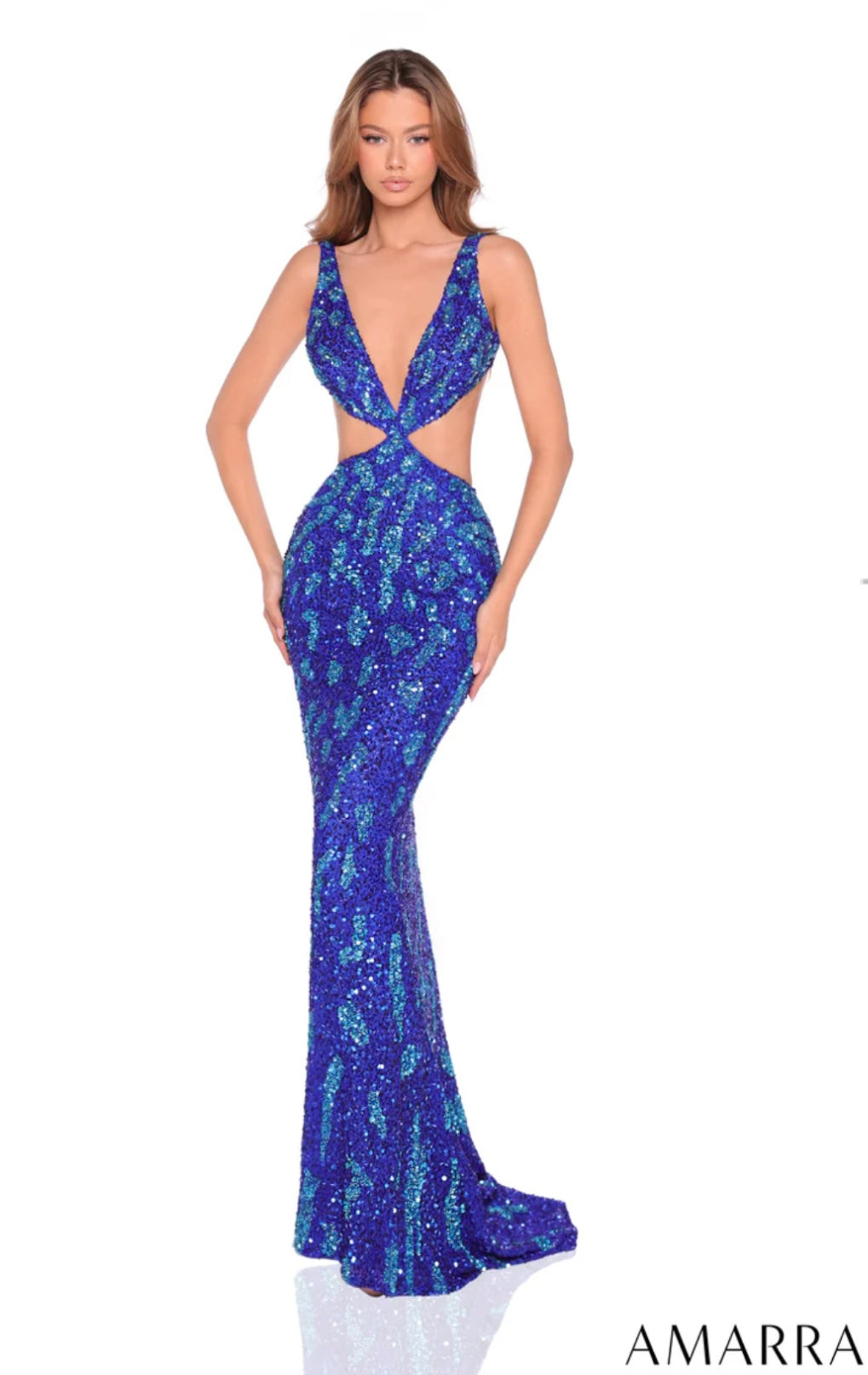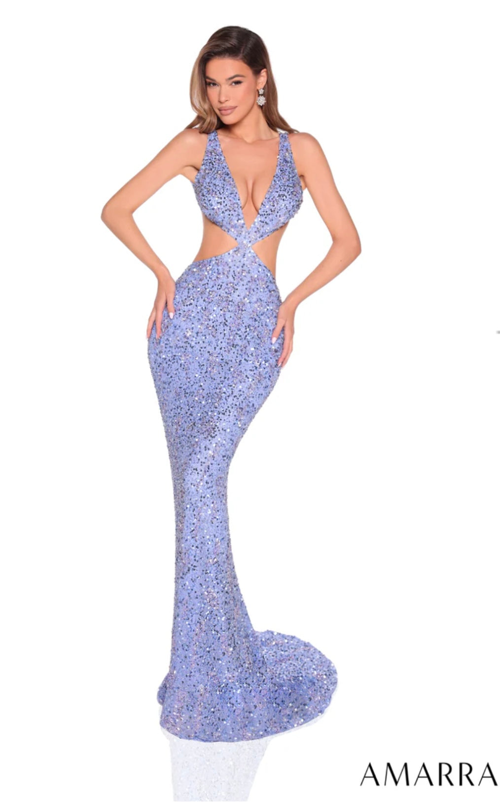 Shimmering long backless fully sequined dress by Amarra with a plunging v-neckline and daring side waist cutouts. This prom dress features a flattering mermaid silhouette and a sweep train.