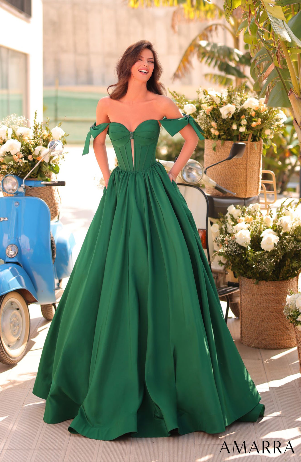 Captivate the night in this off-the-shoulder long a-line prom dress 88995 by Amarra. The gorgeous long prom ball gown features a wrap-around corset that laces up over the open back for the best fit, while oversized bows drape over the upper arms. The long formal dress has a front cut out that offers a sexy vibe, while the ball-gown-style long skirt gathers at the waist before flowing to the floor in an a-line shape. Be the belle of the ball at prom, galas, and other formal events in this off-the-shoulder long a-line prom dress by Amarra.