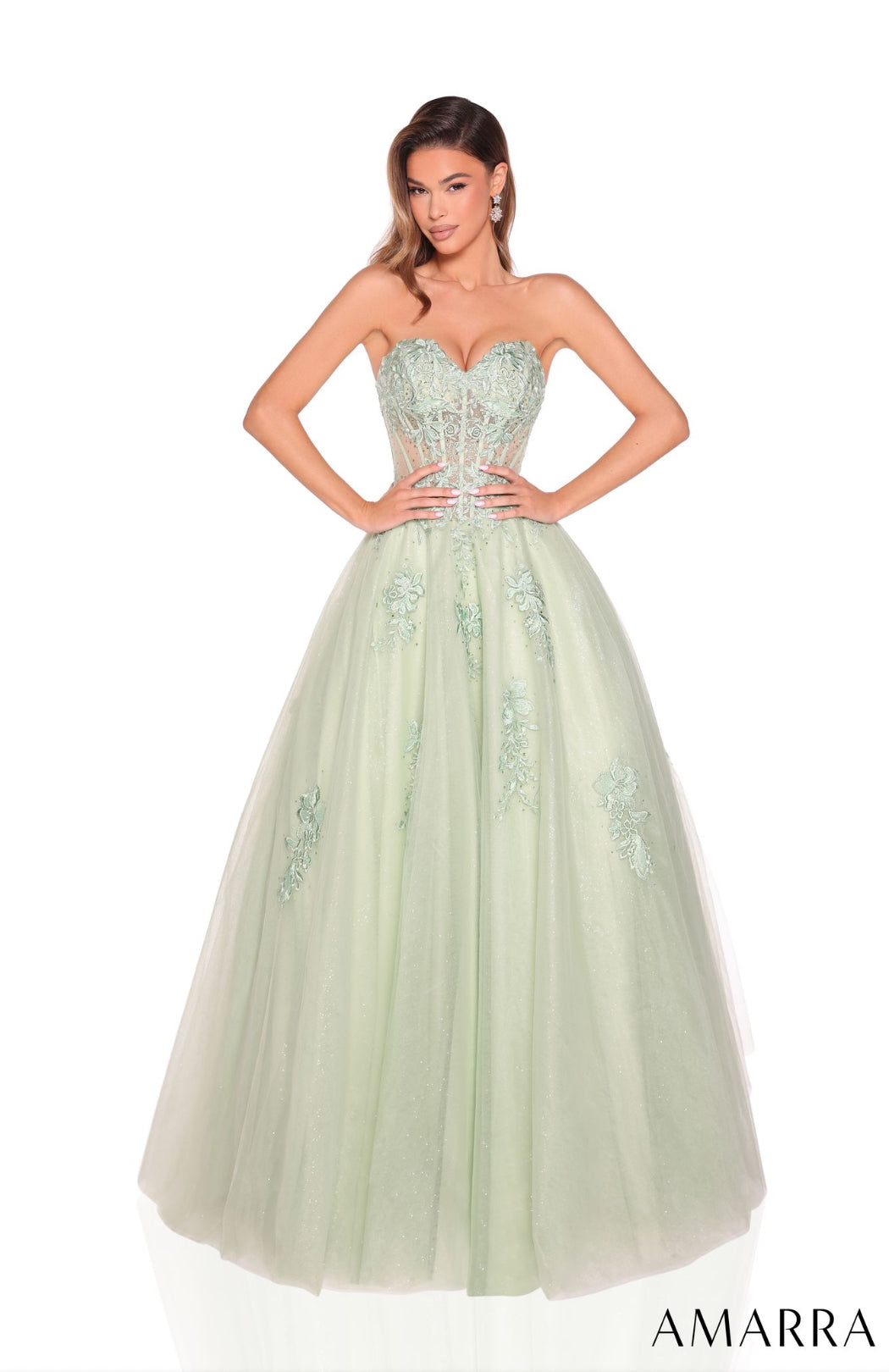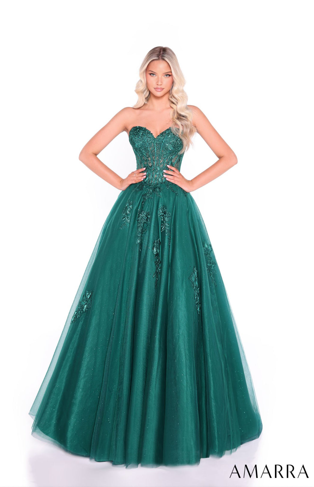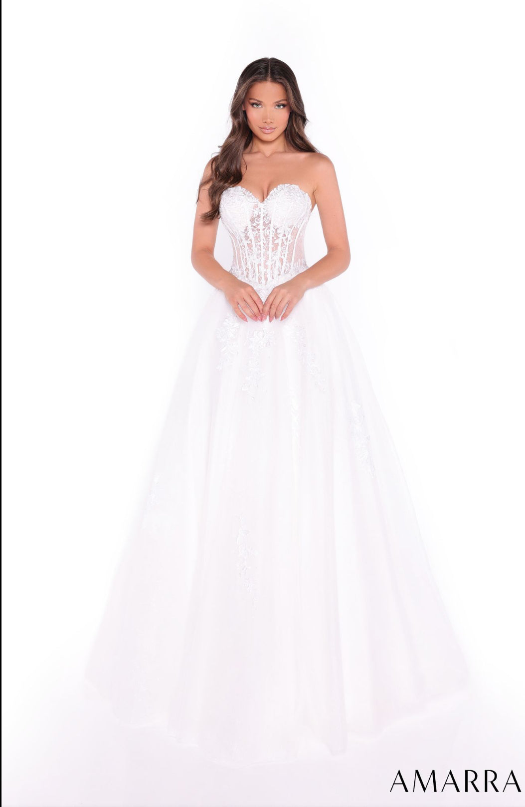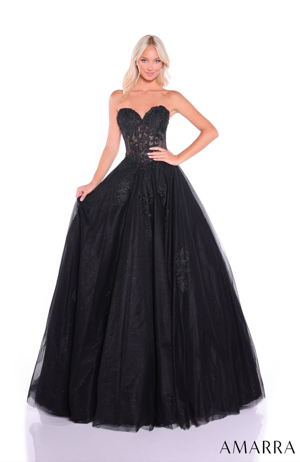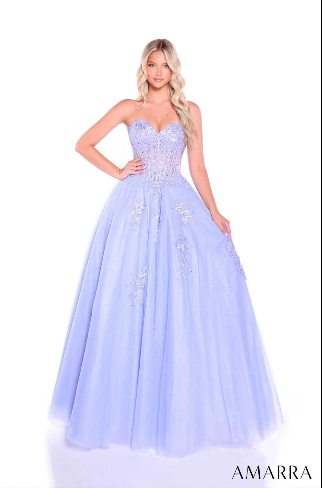 Feel like a princess in this lace-up strapless sweetheart long prom dress 89011 by Amarra. With a sheer embroidered sweetheart bodice, this strapless long evening gown has thin bands that lace up for the best fit at prom, galas, and other formal events. The elegant strapless long formal dress has a fully-lined long ball-gown-style skirt with a sheer embroidered overlay that flows to the floor in an a-line shape. A classic style for the girl who loves a vintage look with modern details, this lace-up strapless sweetheart long prom dress is ready to leave an indelible mark on hearts and memories
