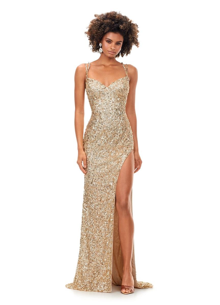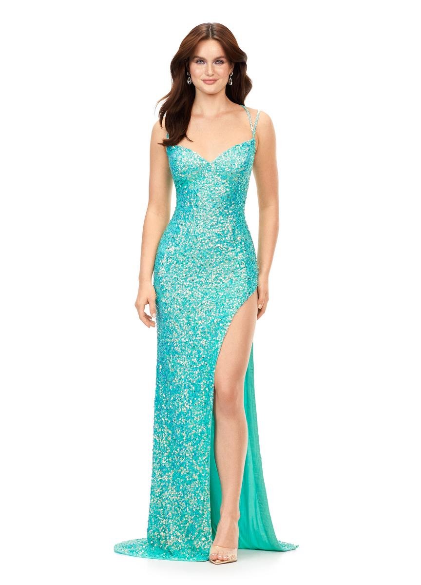 This sequin gown features double spaghetti straps and a sweetheart neckline. The gown is accented with a left leg slit and a lace up back complete with beaded fringe tassels.