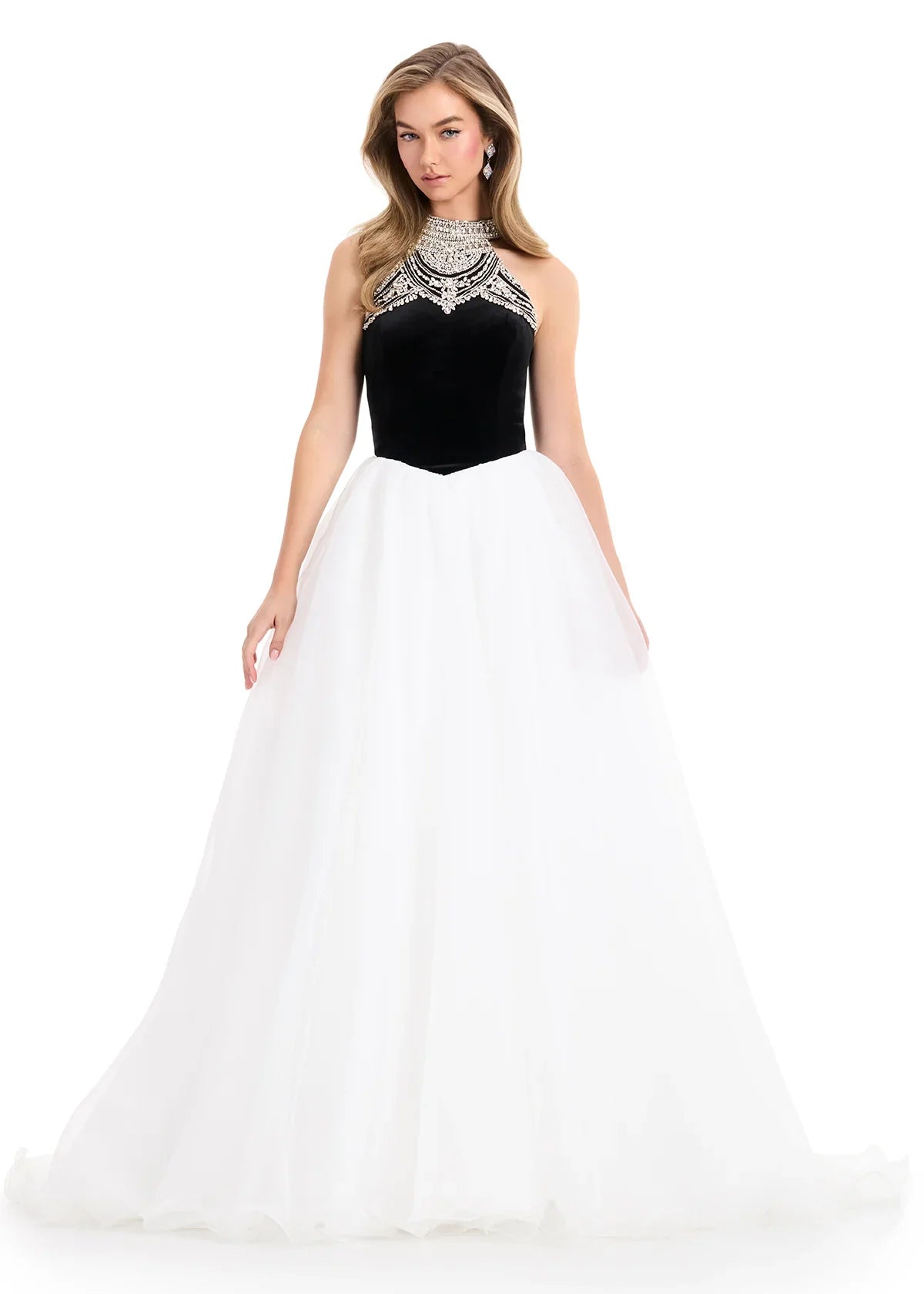 Make a grand entrance in the ASHLEYlauren Style 12050 velvet and organza ball gown. Featuring a beaded halter neckline on a velvet bodice, this gown flows into a full organza skirt with a dramatic train, perfect for proms, pageants, and formal occasions.