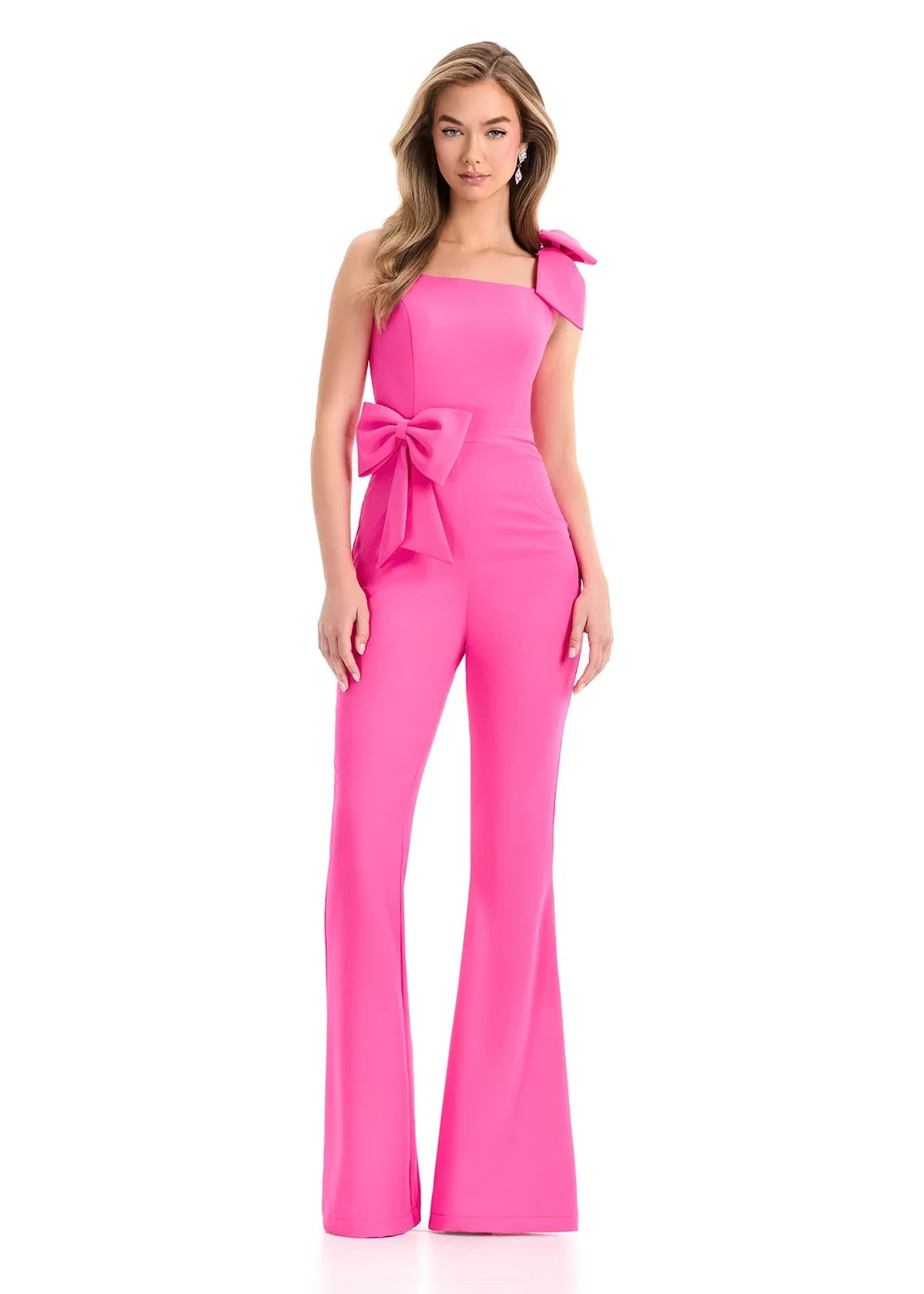 Make a statement in this ASHLEYlauren Style 12052 jersey jumpsuit. Featuring a square neckline, a striking oversized bow at the waist, and flared legs, this jumpsuit is designed for elegance and flair.