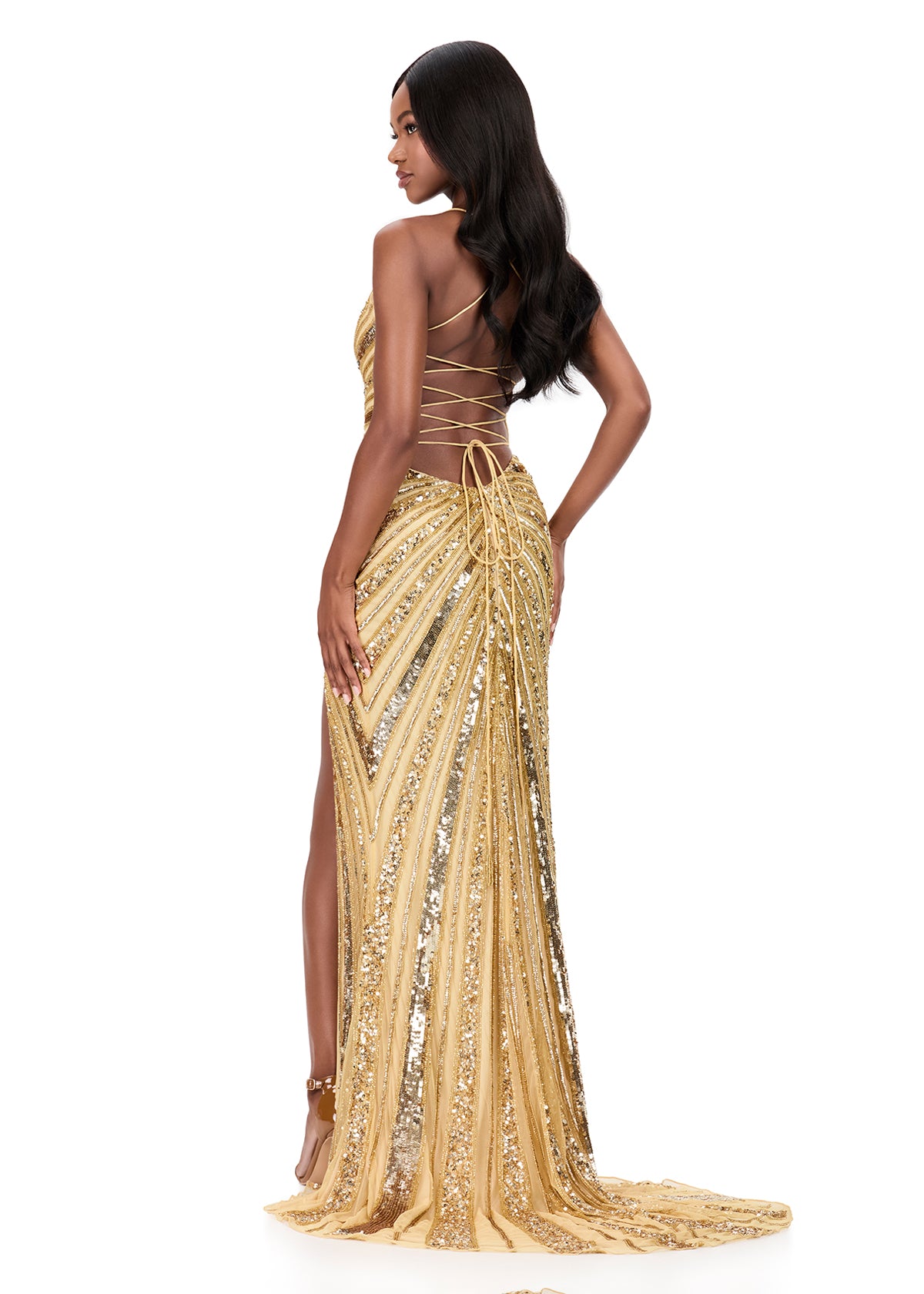 Turn heads in this stunning fully beaded gown by ASHLEYlauren. ASHLEYlauren Style 12149 features a fitted silhouette adorned with intricate beadwork that shimmers from every angle. The plunging neckline, high slit, and lace-up back combine to create a sultry yet elegant look perfect for prom, pageants, or red-carpet events. The sweeping train adds extra drama, ensuring all eyes are on you.Â