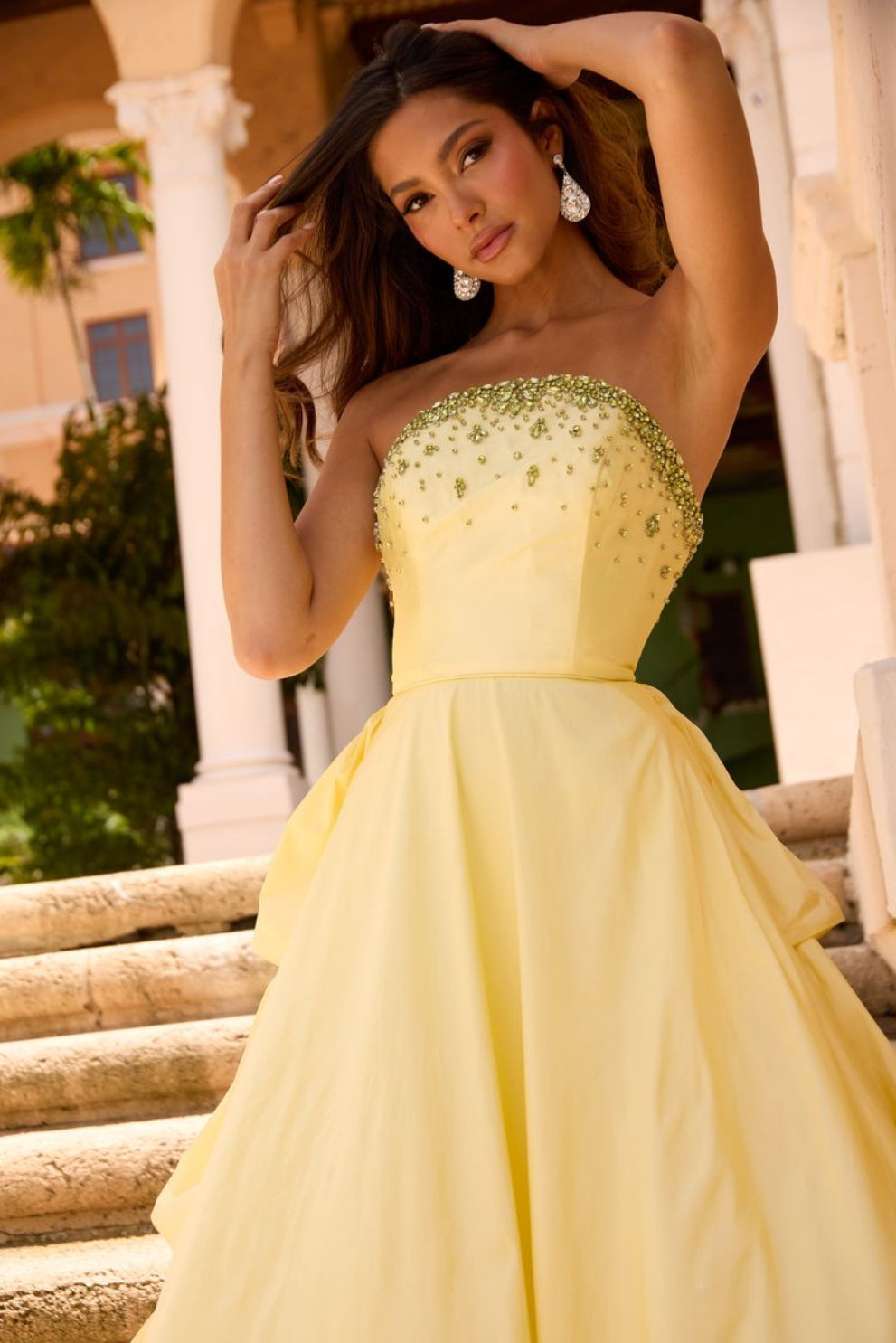 Radiate sunshine and elegance in this stunning Ava Presley 26417 gown. This strapless ball gown features a beautifully embellished bodice adorned with sparkling crystals that gracefully transitions into a full A-line skirt. The back showcases a show-stopping layered ruffle design, adding volume, texture, and drama to your look. Perfect for prom, pageants, or formal events, this gown ensures a graceful entrance and unforgettable presence.