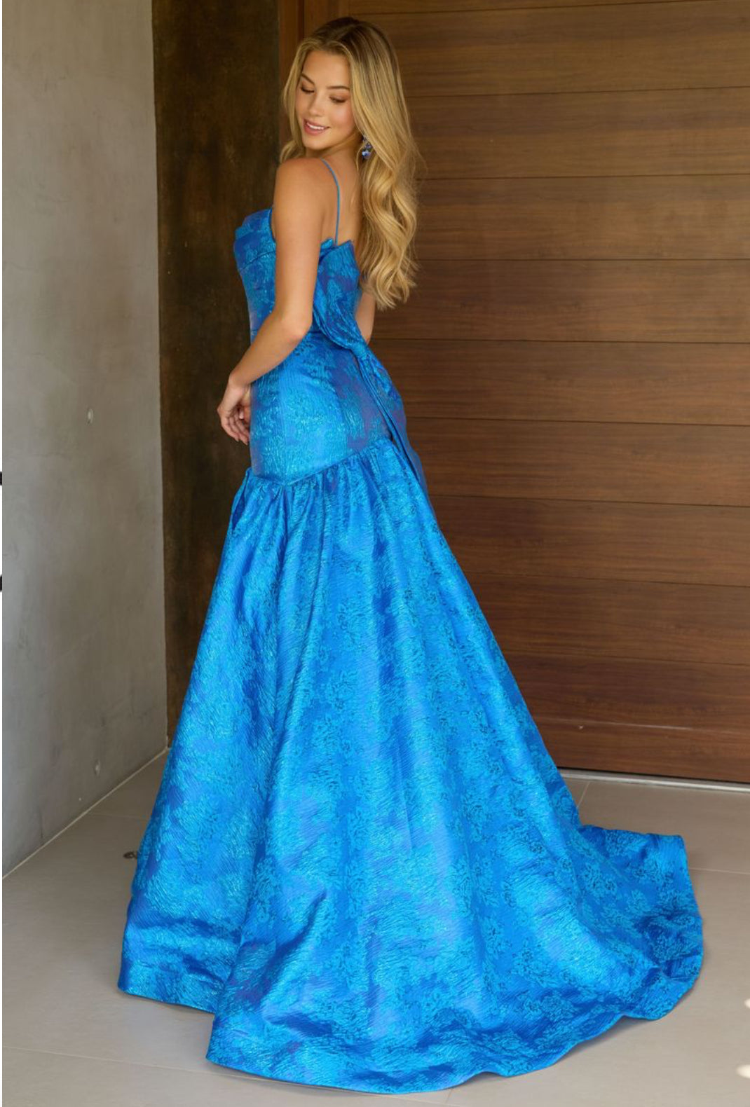Make a sophisticated entrance in the Ava Presley 26419, a breathtaking mermaid-style gown crafted to highlight your curves with timeless elegance. This blush pink creation features shimmering jacquard brocade fabric that glistens under the light, while delicate spaghetti straps and a sculpted bodice offer a romantic touch. The flared skirt flows gracefully to the floor, complemented by a dramatic back bow for an unforgettable finish. Perfect for pageants, proms, or any grand red carpet event where glamour is a must.