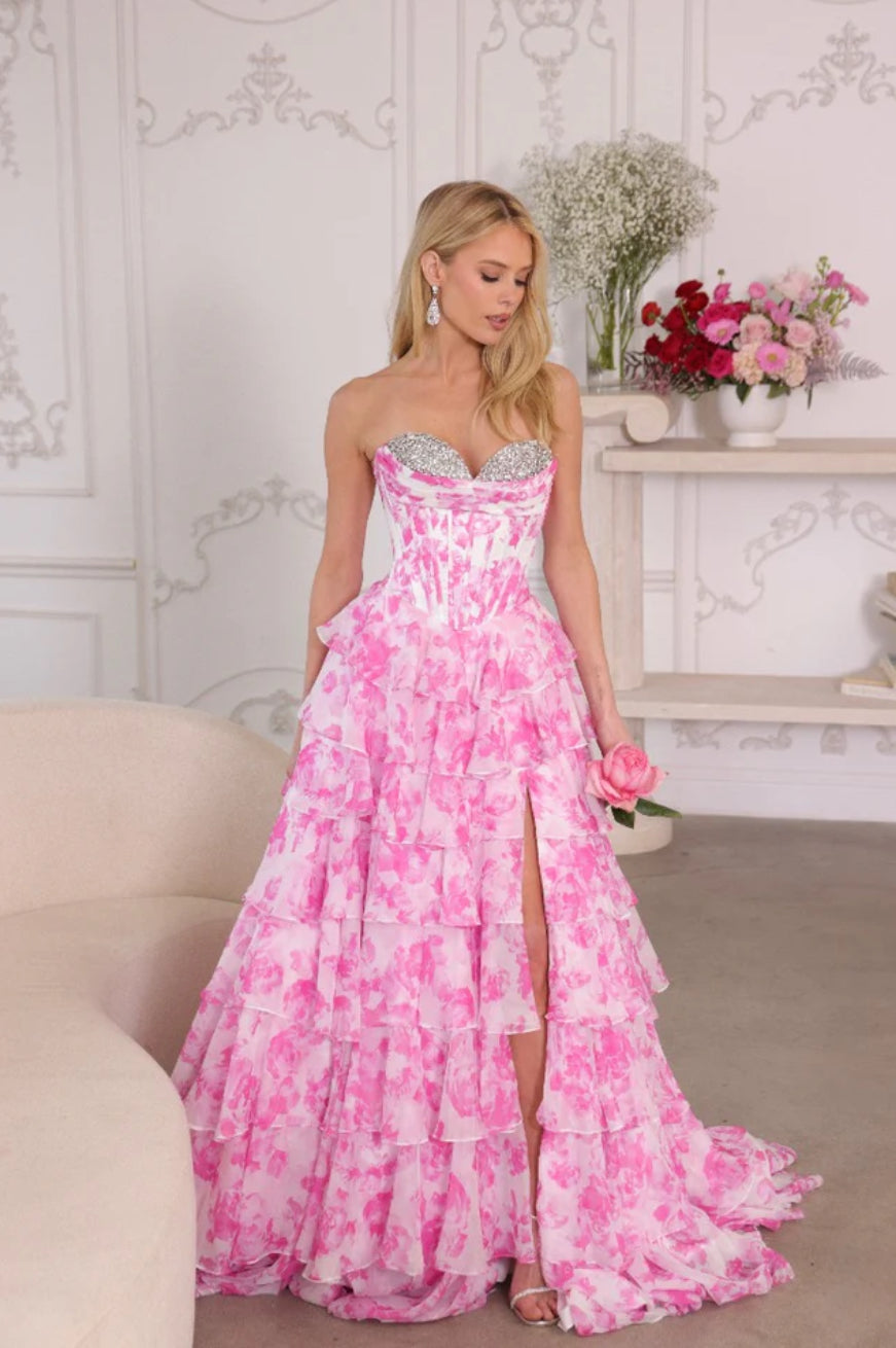 Ava Presley 26441 is a breathtaking strapless ball gown adorned in a soft blue floral print. The fitted bodice features sparkling crystal embellishments along the sweetheart neckline, while the voluminous tiered skirt adds a touch of whimsical romance. A daring front slit offers a modern twist, making it a perfect statement piece for pageants, prom, or formal occasions.