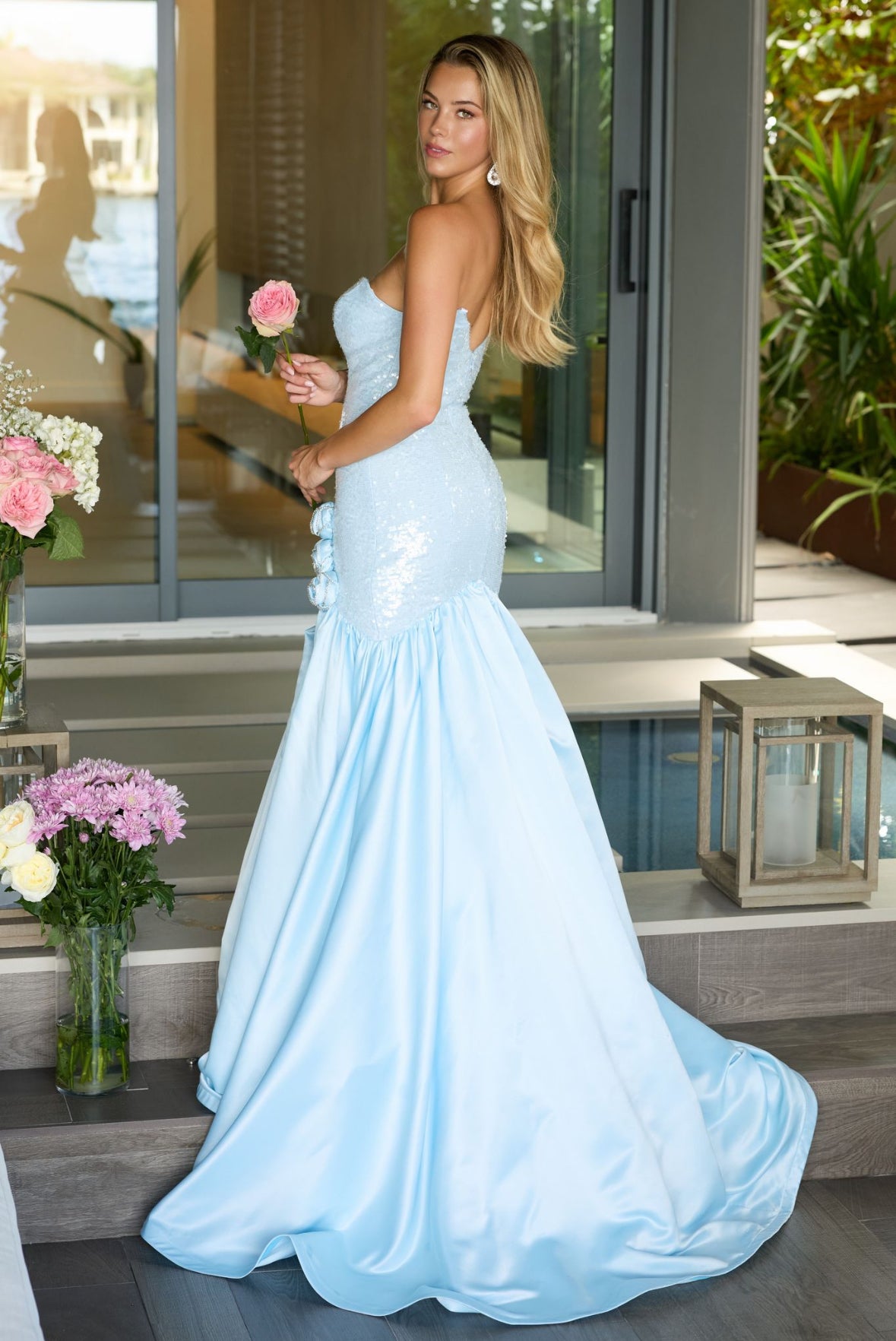 Make a mesmerizing entrance in the Ava Presley 26520 gown. This shimmering mermaid dress features a dazzling sequin bodice and a soft satin flare that flows into a graceful train. The sweetheart neckline and side slit add a touch of elegance and allure, while floral accents at the hip give it a feminine twist. Perfect for prom, pageants, or red carpet moments.