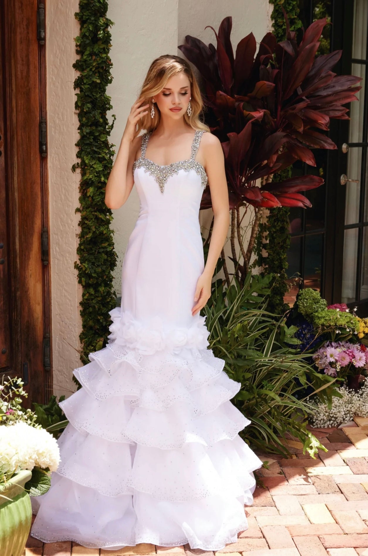 The mermaid silhouette hugs the body before flaring out into a tiered, ruffled skirt. Layers of organza adorned with subtle crystal details give the skirt volume and a whimsical touch. Delicate floral appliques sit at the transition from bodice to skirt, enhancing the romantic feel of the dress. Ideal for prom, formal occasions, weddings, or any event where you want to make a grand entrance.