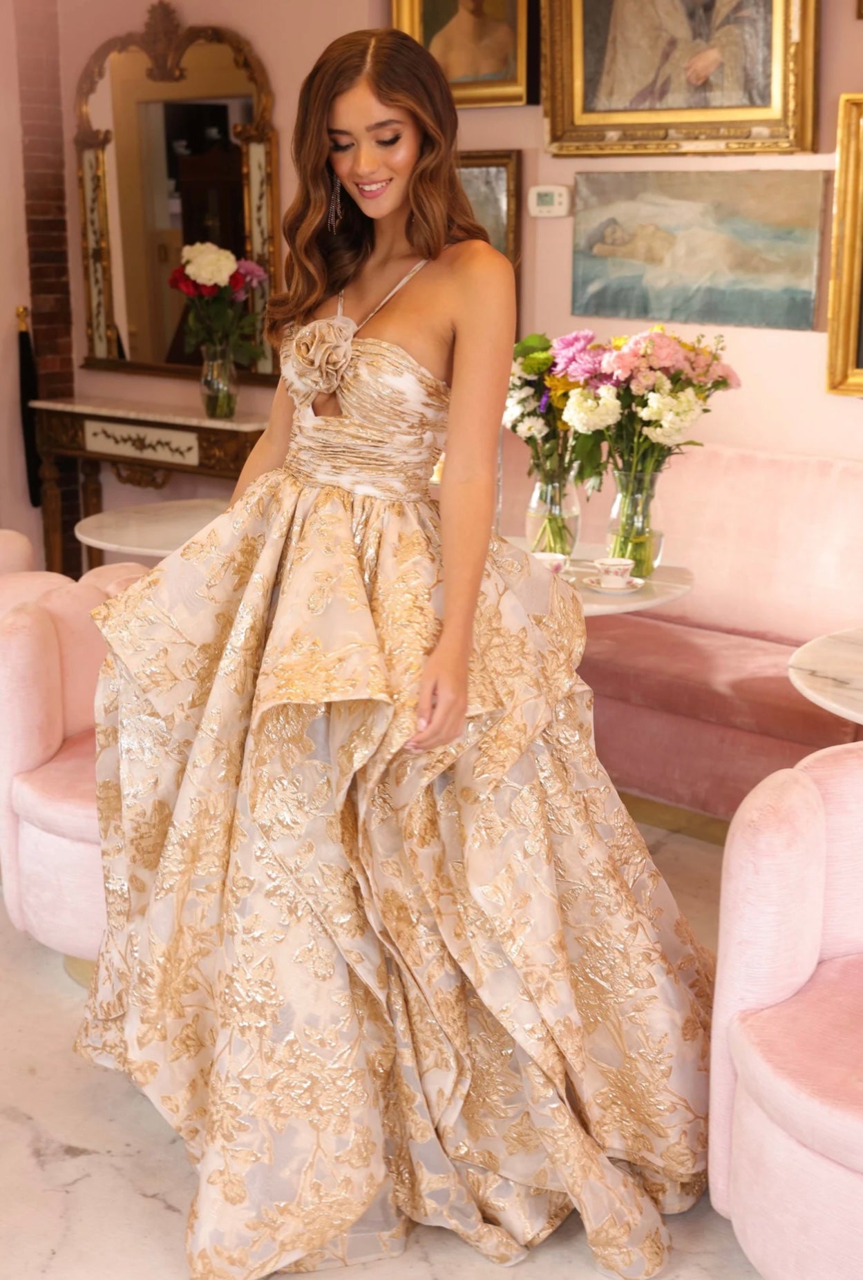 The voluminous skirt is designed with a luxurious fabric that showcases intricate gold floral patterns, giving the gown a regal and opulent feel. The layered structure of the skirt adds depth and movement, making it perfect for formal events like prom, galas, or weddings where making a grand statement is essential.