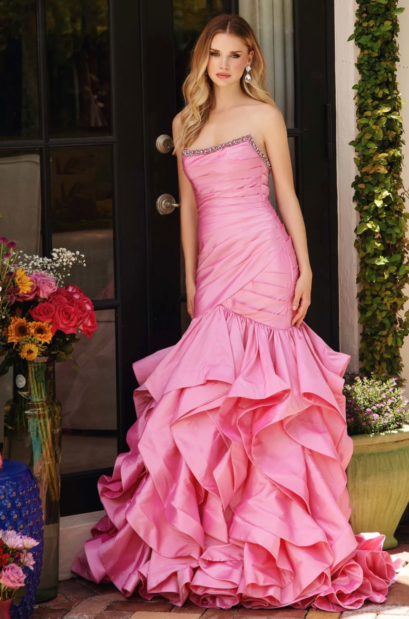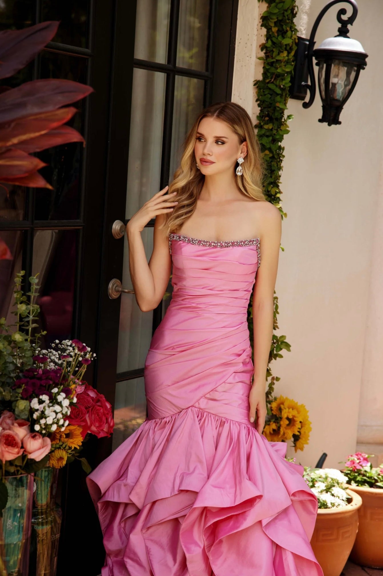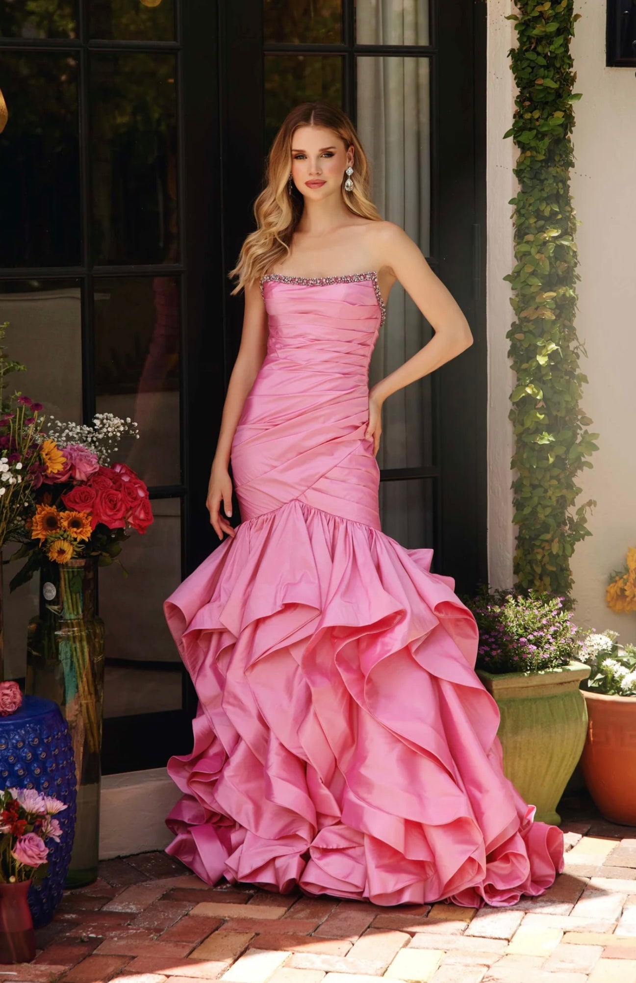 The Ava Presley style 40068 is a stunning strapless gown in a vibrant pink shade. The dress features intricate ruching throughout the bodice, creating a flattering and form-fitting silhouette. The neckline is adorned with sparkling embellishments, adding a touch of glamour. The gown transitions into a dramatic mermaid-style skirt with layered ruffles, offering a voluminous and eye-catching design. This dress is perfect for making a bold statement at prom or any formal event, combining elegance with a playful, feminine flair.