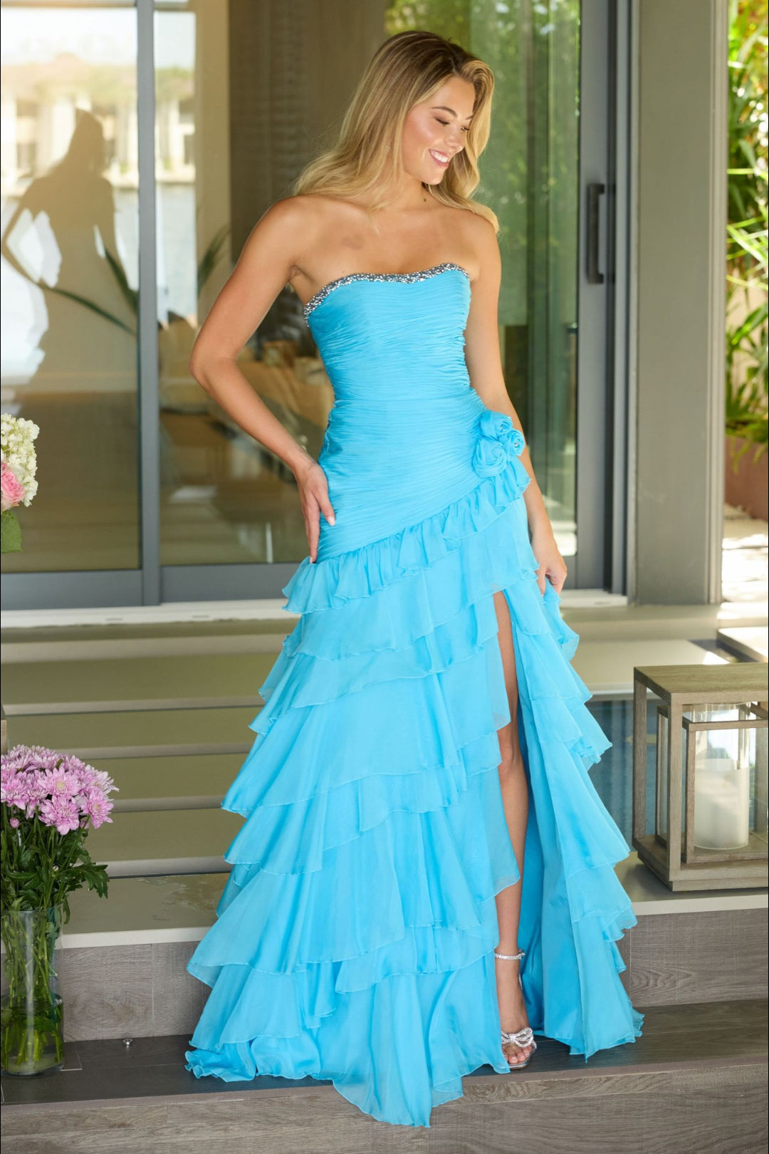 Ava Presley 42242 captures attention with its romantic ruching and cascading ruffle layers that flow effortlessly into a dramatic high slit. The floral applique at the waist adds a soft, feminine detail, while the fitted bodice flatters the silhouette with a modern strapless neckline. Perfect for making a memorable entrance at any formal event.