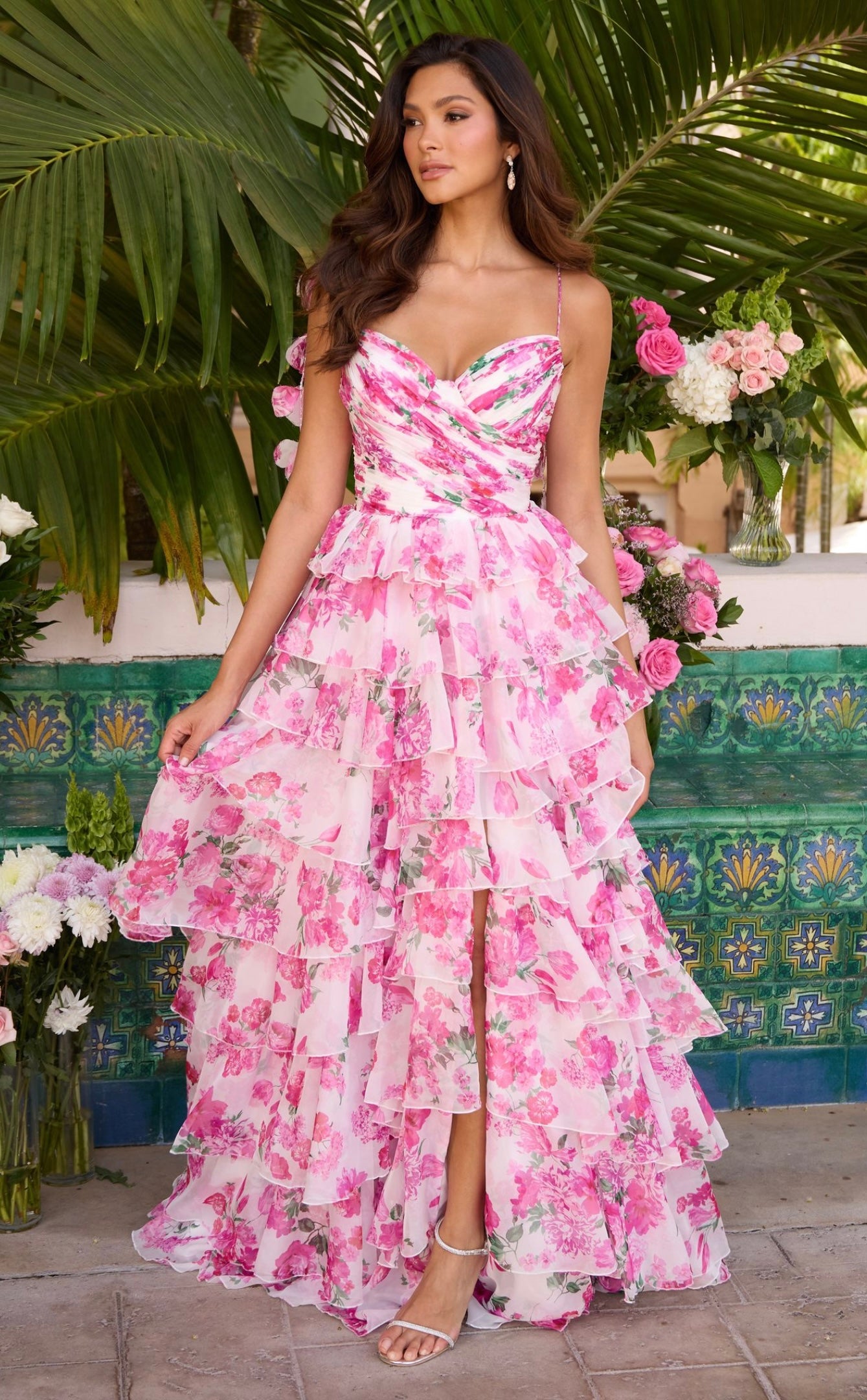 Make a statement in the breathtaking Ava Presley 42332 floral high-low gown, a sophisticated choice for those seeking timeless elegance with contemporary flair. This enchanting dress features romantic pink rose prints that bloom across luxurious fabric, complemented by cascading ruffle tiers that create dynamic movement and visual interest. The sweetheart neckline exudes femininity while flattering a variety of body types, while delicate floral shoulder straps add an intricate design element that draws the eye upward. An open back design completes the ethereal silhouette, offering a daring yet refined touch perfect for making an unforgettable entrance. The high-low hemline provides versatility—allowing graceful movement while maintaining an air of sophistication. Ideal for proms, pageants, garden-inspired events, and special occasions where you want to command attention with understated glamour, this gown delivers both confidence and charm in one stunning package.