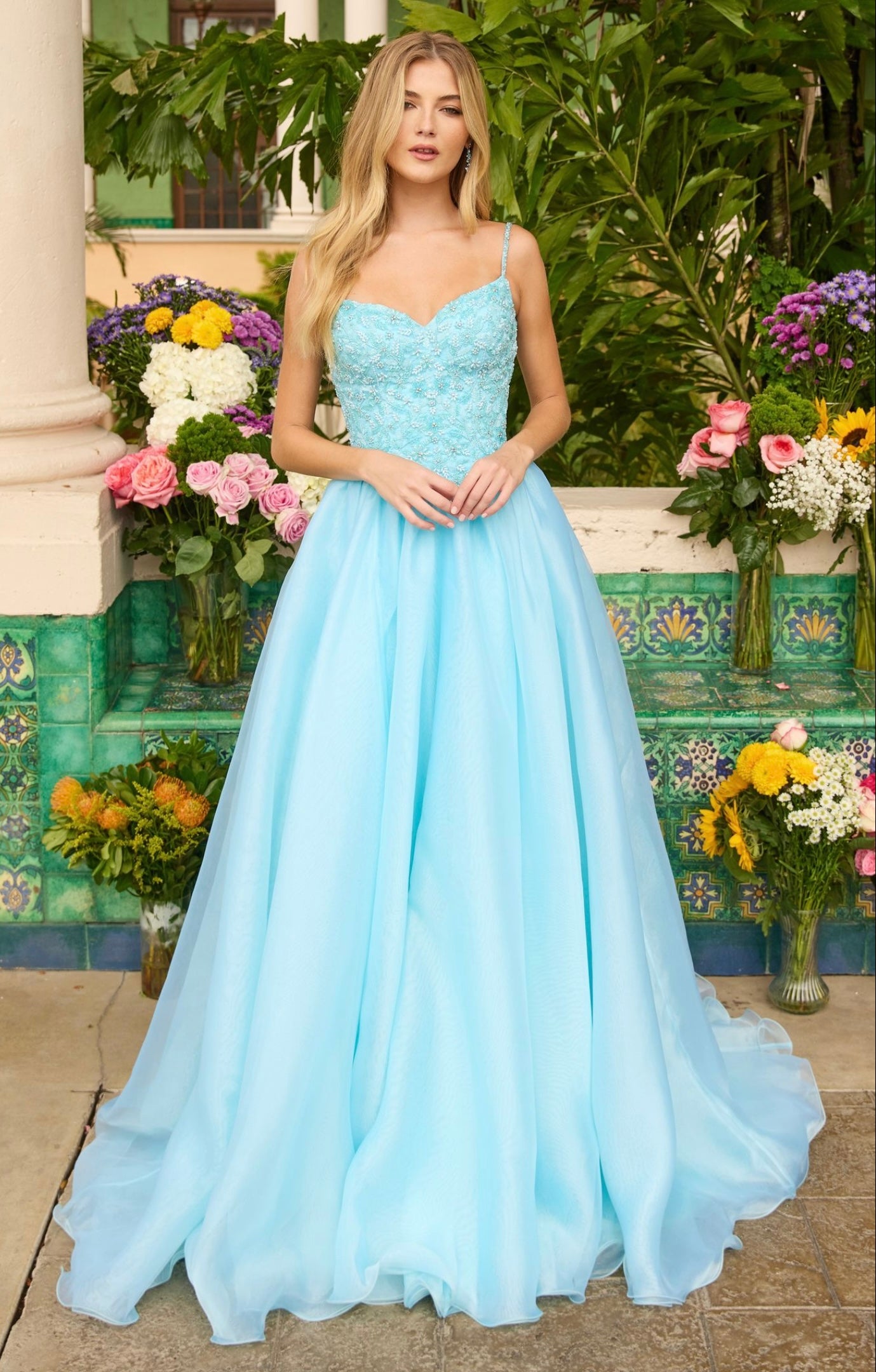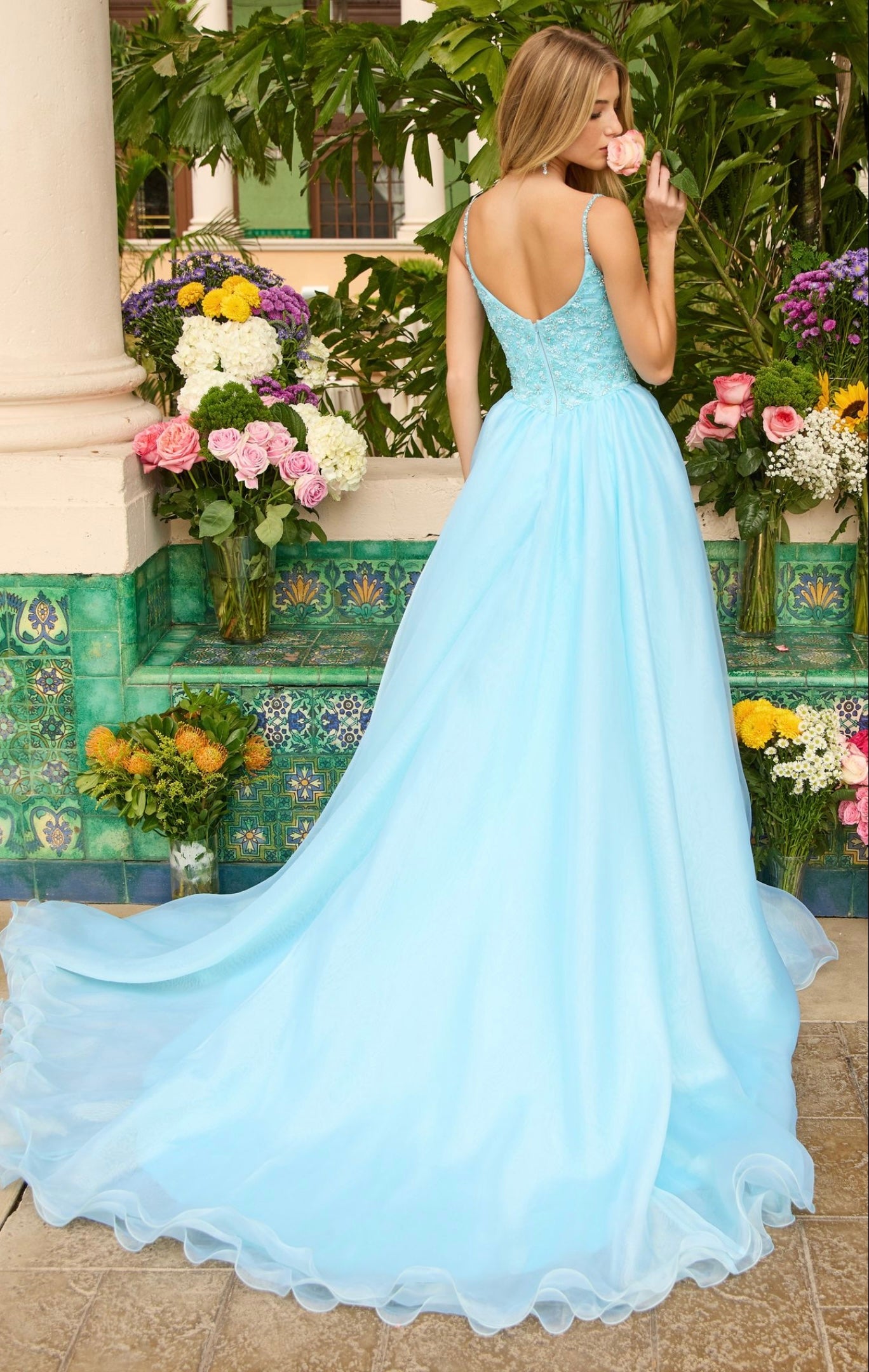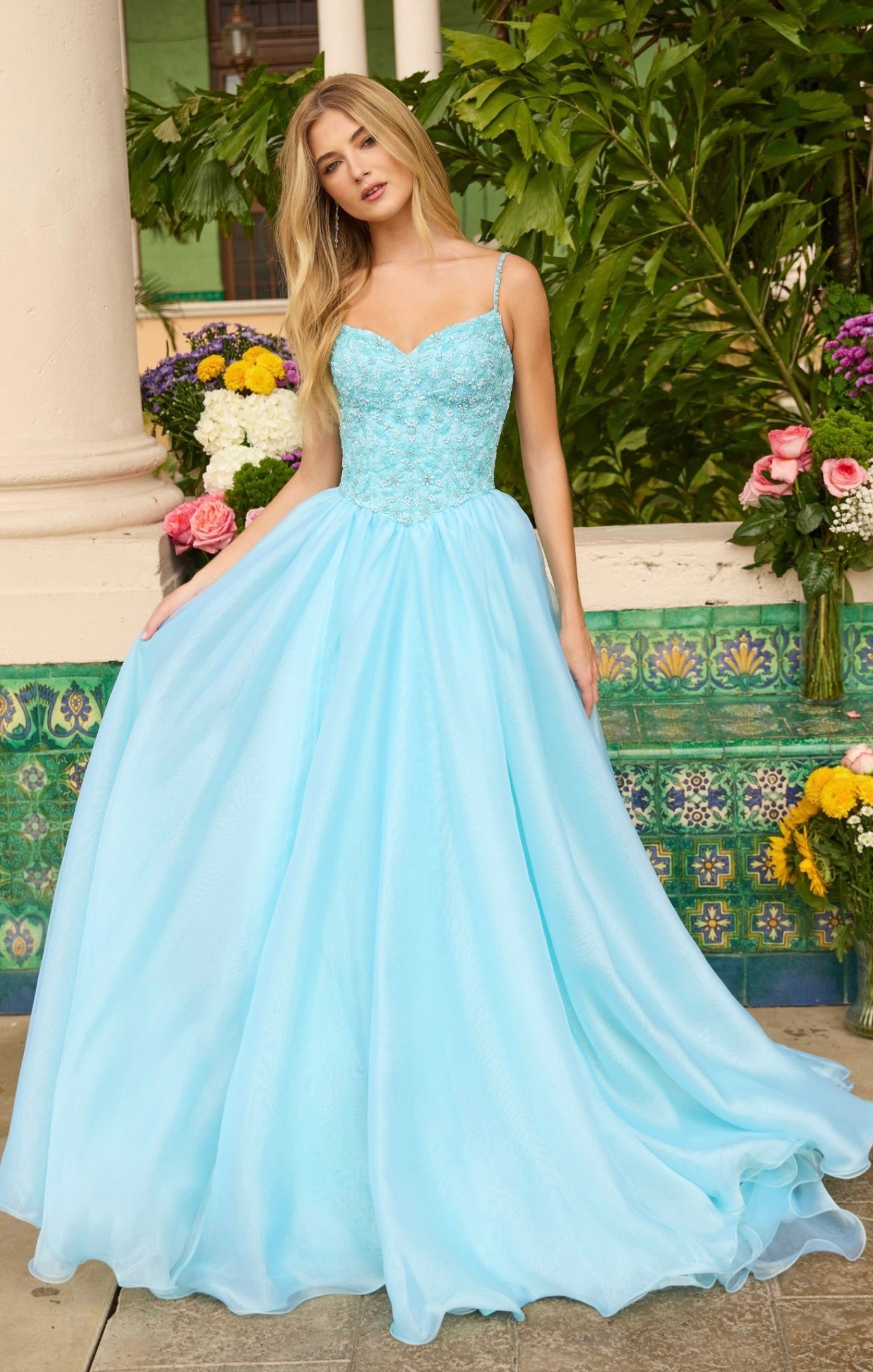 Make a graceful statement in Ava Presley 47242, a sky-blue ballgown designed for fairytale entrances. The delicately embellished bodice shimmers with intricate floral lace, while the voluminous layered tulle skirt flows with airy elegance, perfect for pageants or quinceaneras.