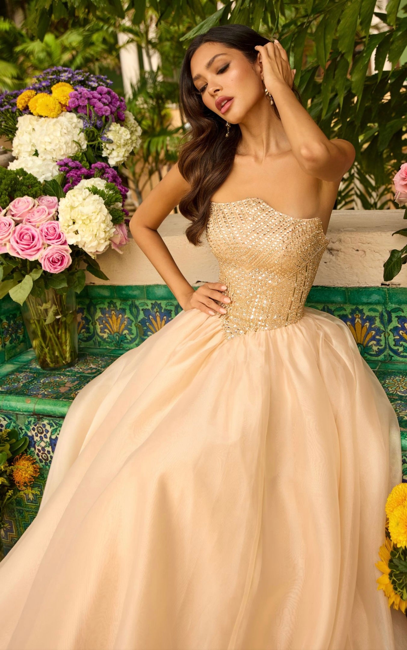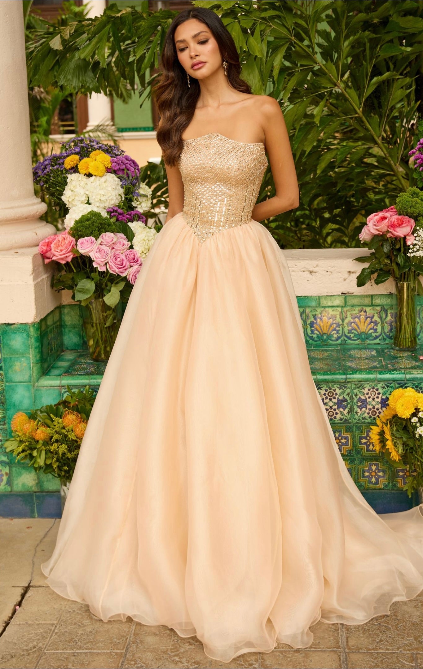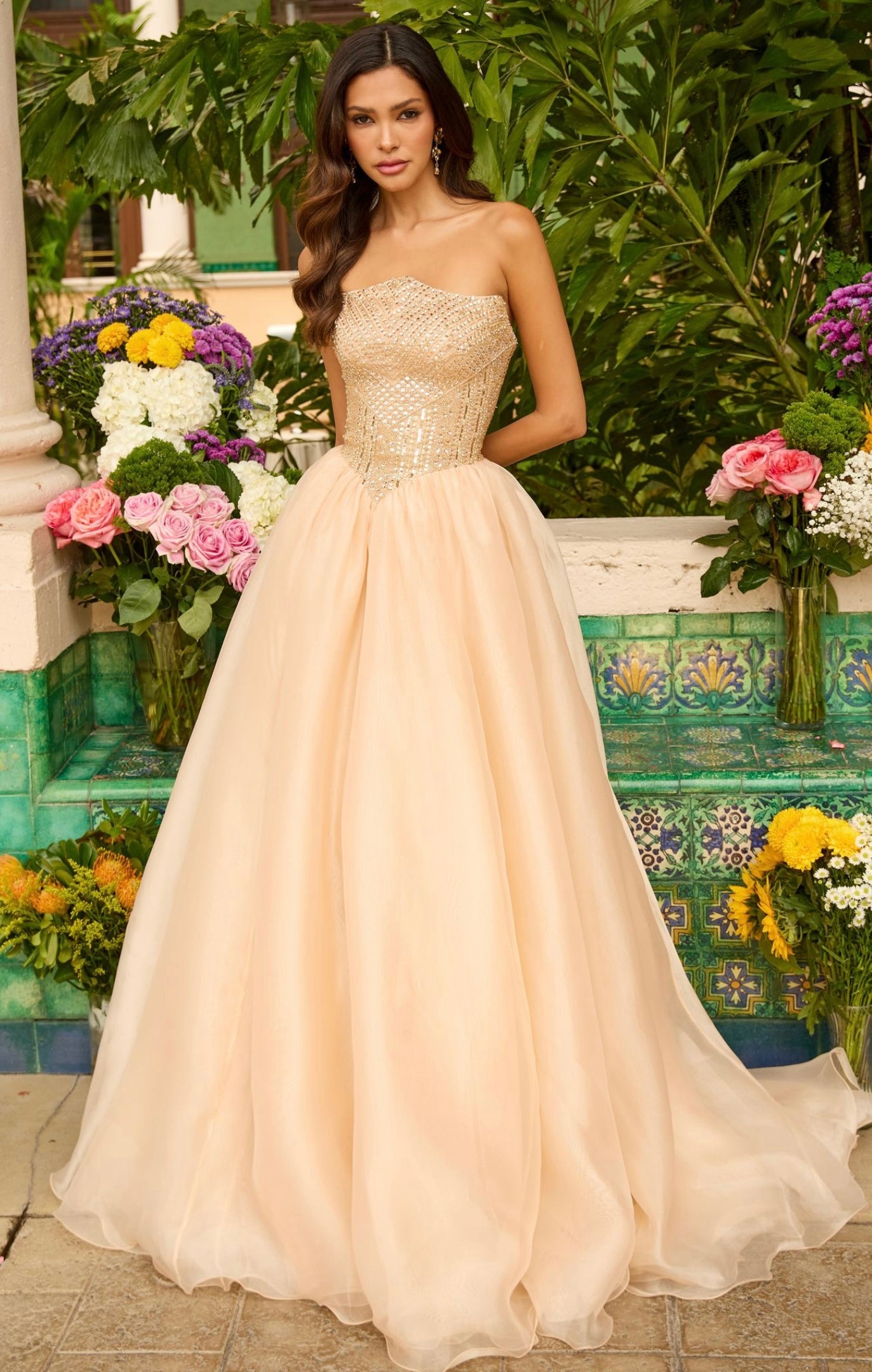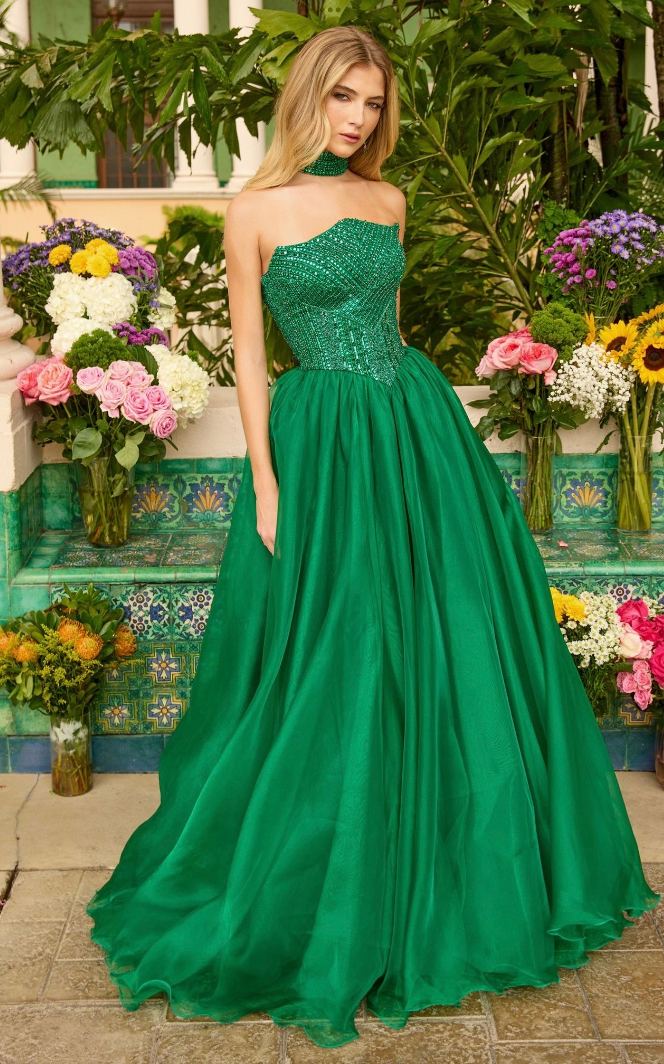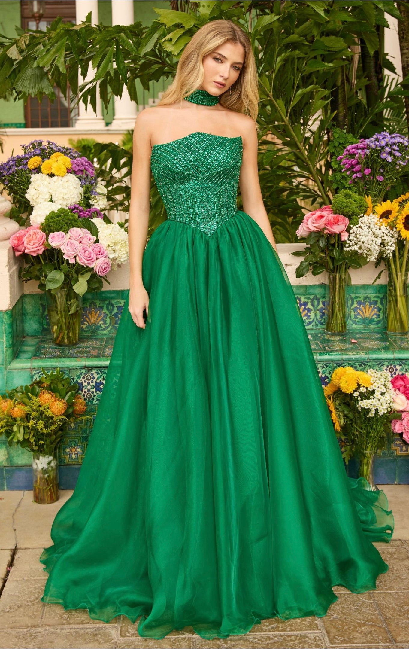 A bold emerald statement for any formal event, the Ava Presley 47255 gown captivates with its rich color and timeless ball gown silhouette. The fitted bodice features shimmering embellishments and a flattering strapless neckline, while the voluminous skirt flows gracefully with every step.