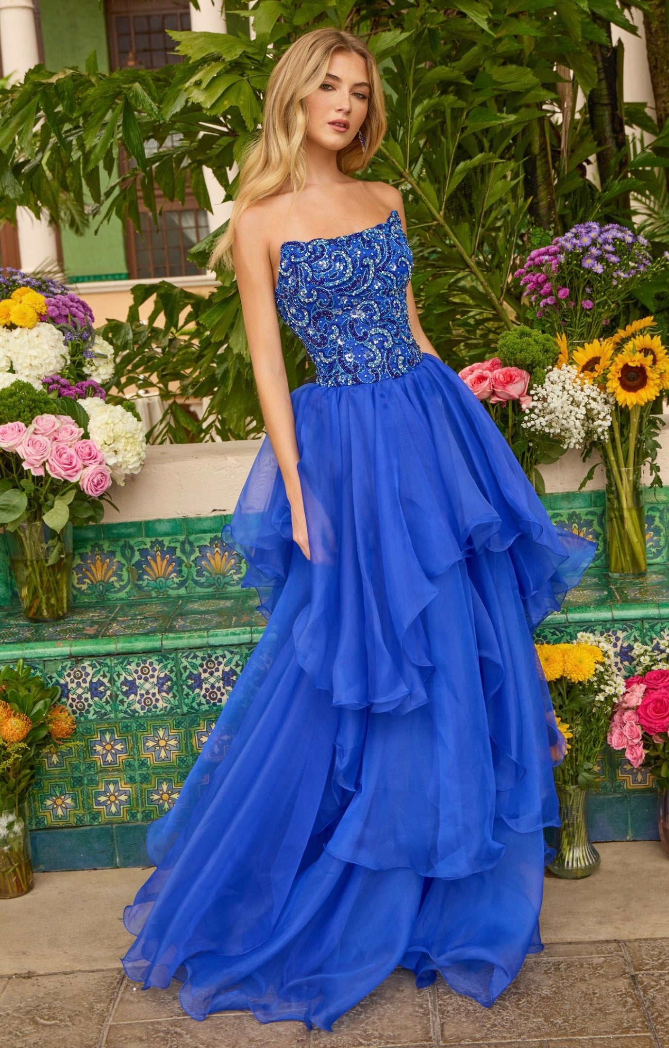 Make a grand entrance in Ava Presley 47271, a captivating royal blue ball gown designed for statement-making events. The strapless bodice is adorned with sparkling embellishments that catch the light beautifully, while the voluminous tiered skirt cascades in layers of soft organza for a dramatic, princess-worthy effect. Whether it’s prom, a pageant, or a red carpet affair, this gown promises unforgettable elegance.