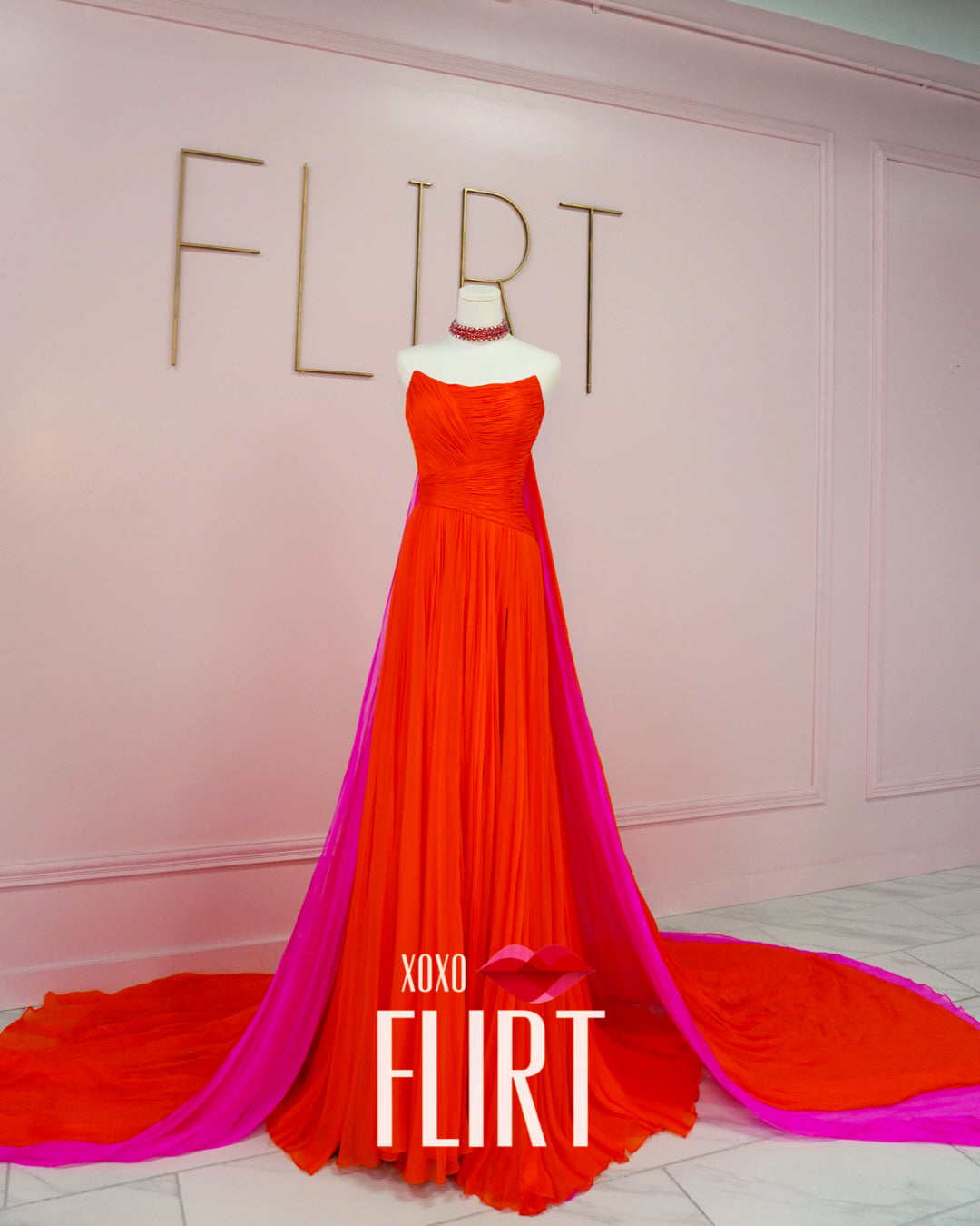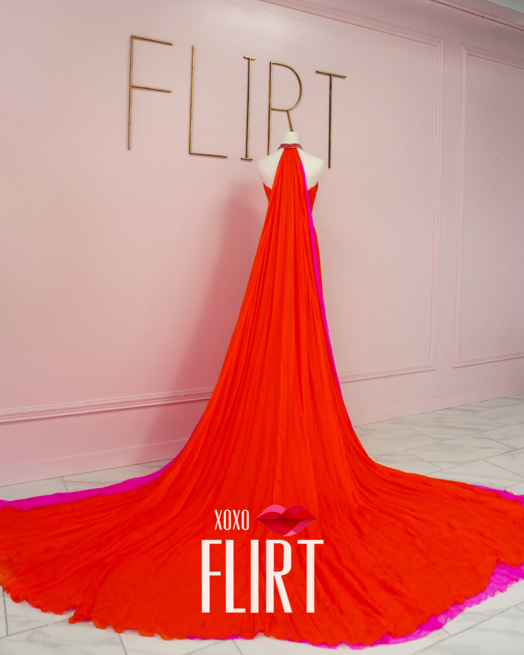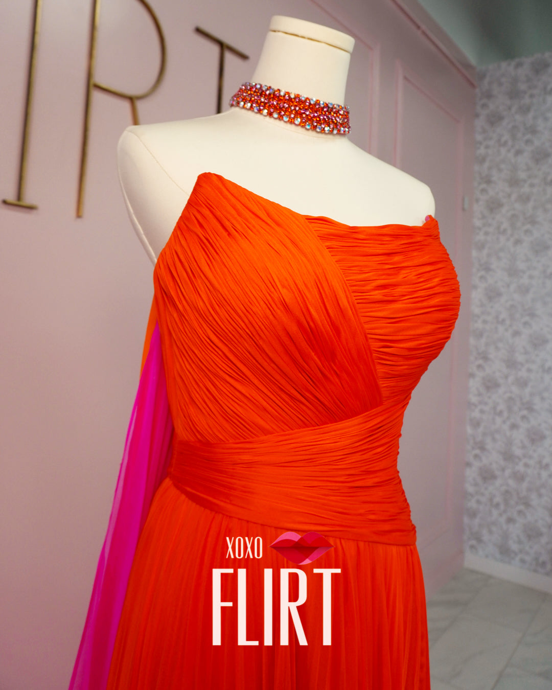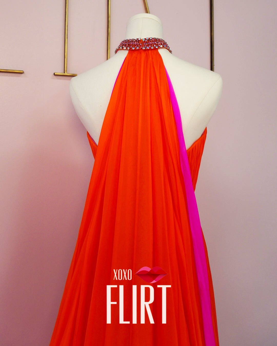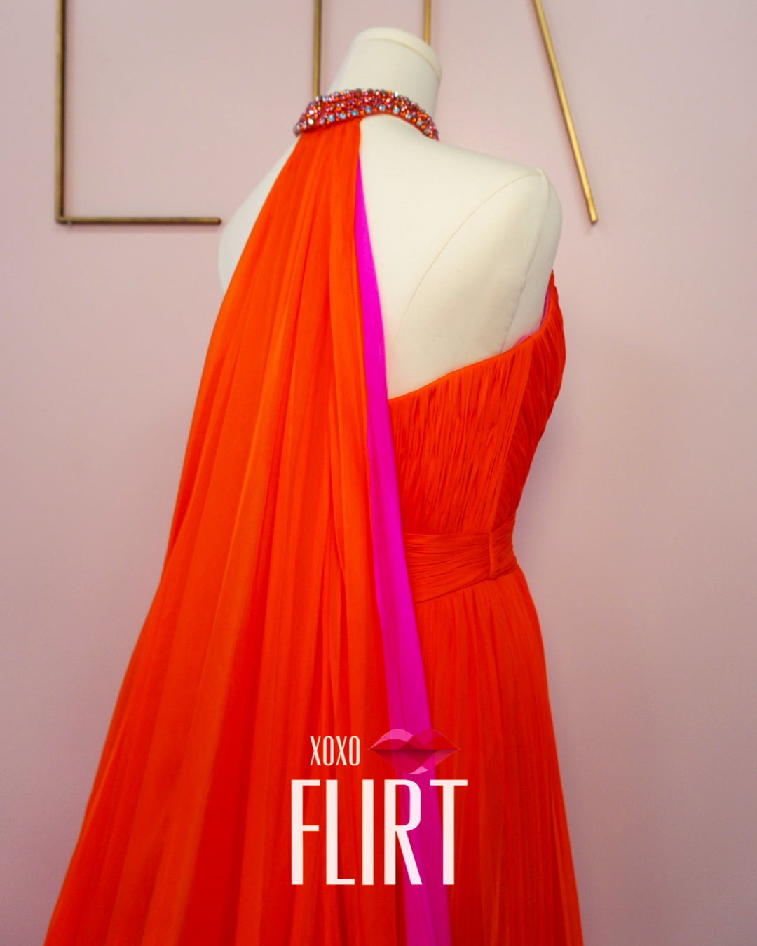 Make a bold color statement in this vibrant couture gown featuring striking orange and hot pink silk chiffon. The luxurious ruching across the bodice creates dimension and flatters your silhouette, while the dramatic choker cape in complementary two-tone colors adds theatrical elegance and movement. This is couture design at its finest—perfect for competitors who embrace confidence and refuse to fade into the background at pageants and formal events.