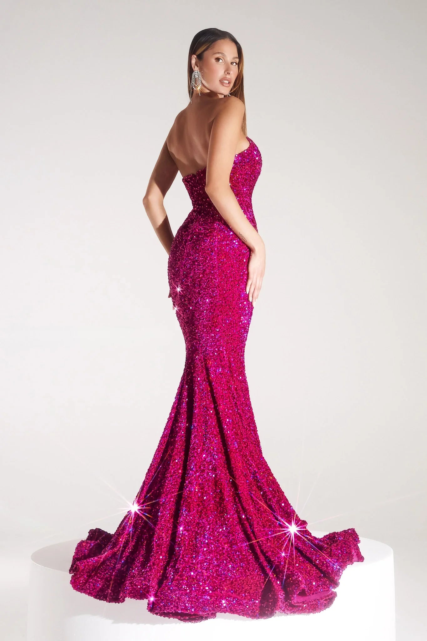 Make a statement in this stunning Portia and Scarlett mermaid gown that's pure glamour from every angle. The plunging sweetheart neckline draws all eyes your way, while thousands of shimmering sequins catch the light with every move. This fully sequined masterpiece hugs your curves in all the right places before flaring into an elegant mermaid silhouette that commands the dance floor. Perfect for prom night when you're ready to shine brighter than the stars.
